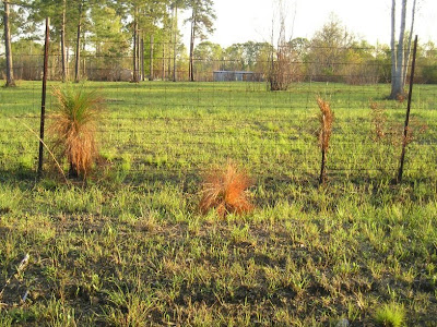 Notice the candle bulb on this young longleaf pine. It is leaving the grassy stage and will experience upward growth for the coming decades. This pine is in my front yard. The larger trees in the background are slash pines.
