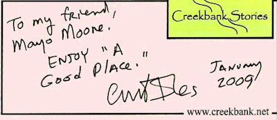 “Mayo Moore” listed in the sample book plate is the narrator of my new novel, A Good Place.