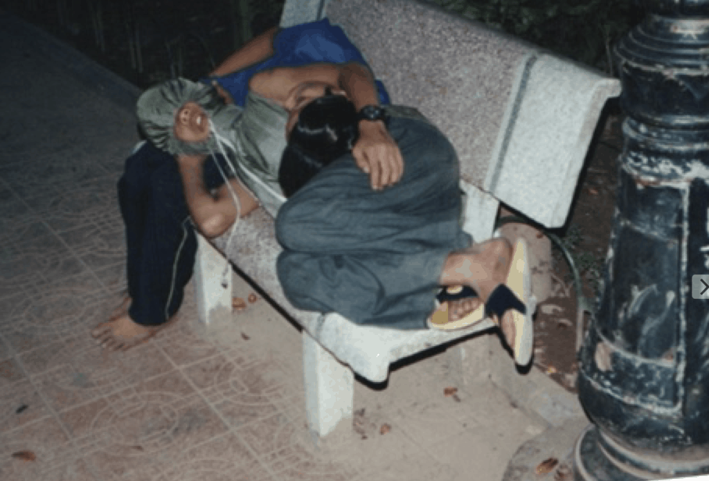 Two Homeless Hanoi boys sleeping near West Lake on a cool night.